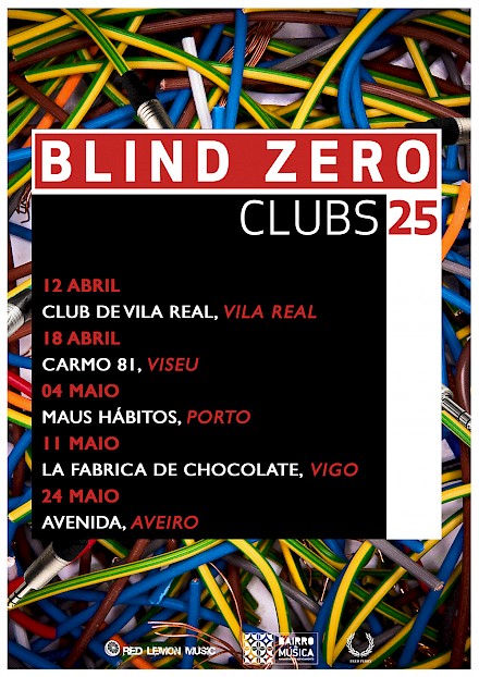 Blind Zero voltam onde tudo começouOs Blind Zero celebram 25 anos de percurso e para marcar a efeméride a banda volta aos clubes, onde tudo começou. Uma digressão olhos nos olhos, sem rede, num total de cinco noites irrepetíveis, entre Portugal e Espanha, onde os Blind Zero vão revisitar temas de toda a discografia. Dia 12 de Abril, a banda actua no Club de Vila Real; dia 18 no Carmo 81, em Viseu; dia 4 de Maio, nos Maus Hábitos no Porto; dia 11 na Fabrica de Chocolate, em Vigo; e dia 24 no Avenida, em Aveiro.