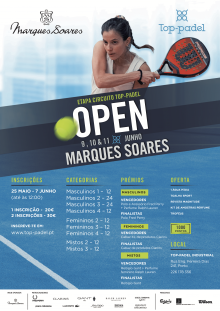 No próximo fim-de-semana, dias 9, 10 e 11, será realizado um Torneio de Padel, cuja organização está a cargo da Top-Padel e sendo o nosso cliente Marques Soares o “main sponsor”. O evento terá lugar no Top-Padel, na zona Industrial do Porto.
